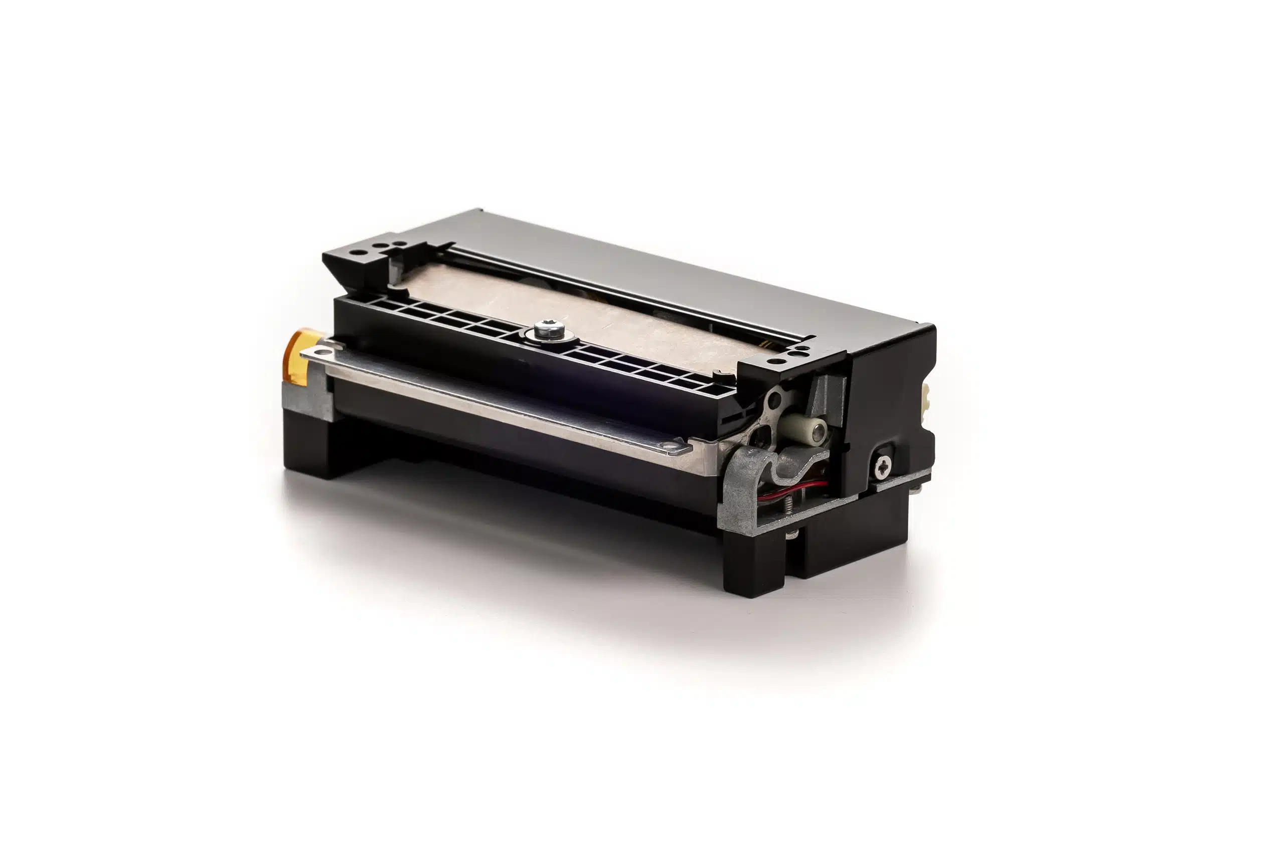 Impressora compacta de 12V com cortador integrado, versão para quiosque com detecção de marca preta à direita.